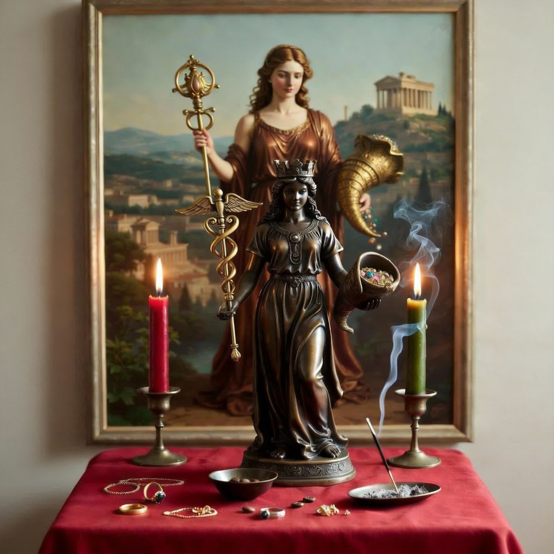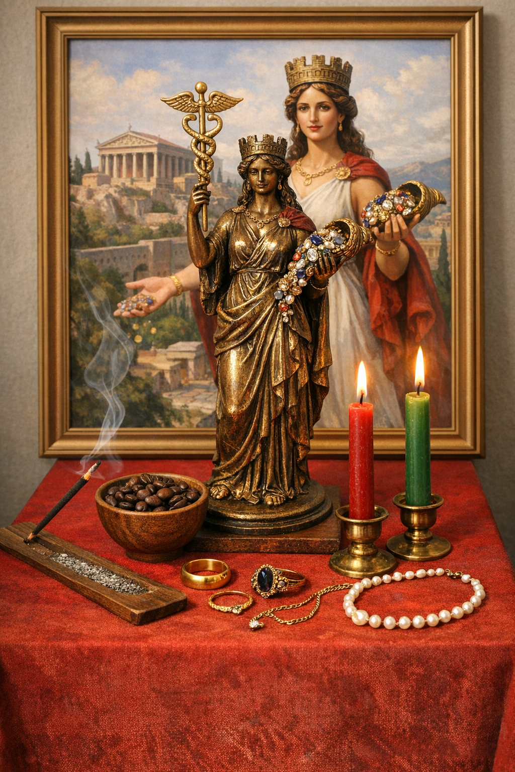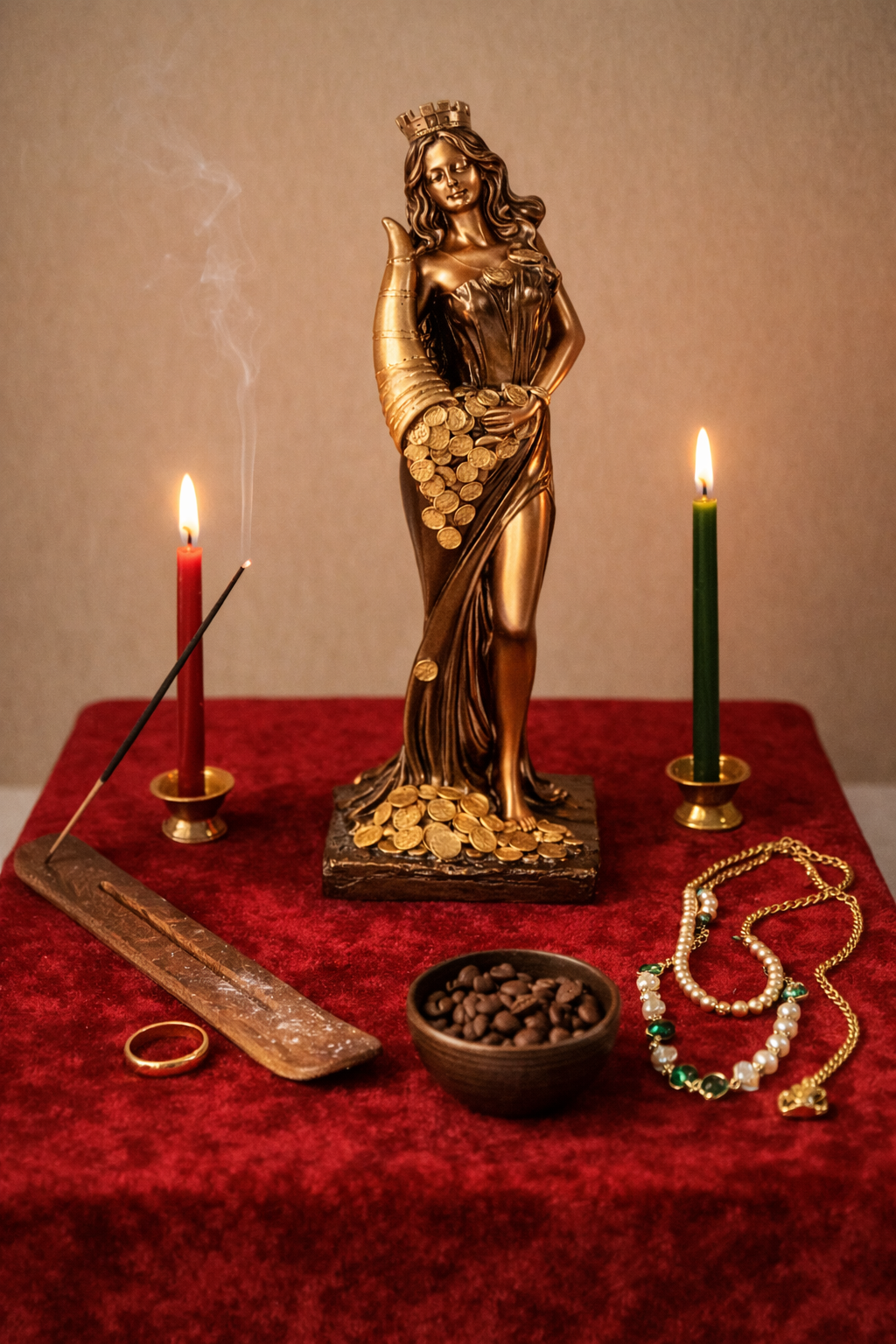 Желателен столик квадратной формы, который нужно покрыть алтарным полотном, желательно из бархатистой ткани или шелка. Цвет ткани должен символизировать для вас богатство и благополучие. Мне нравятся красный и черный цвета. Свечи желательно восковые, зеленого и красного цветов (это символика материального благополучия, любви и здоровья). При работе в соответствии с западной традицией можно по углам алтаря поставить белые свечи, но это не обязательно. Так же можно использовать цвета по планетарным и/или стихийным соответствиям. Можно использовать благовония (ароматические палочки). Хорошо подходит аромат розы.