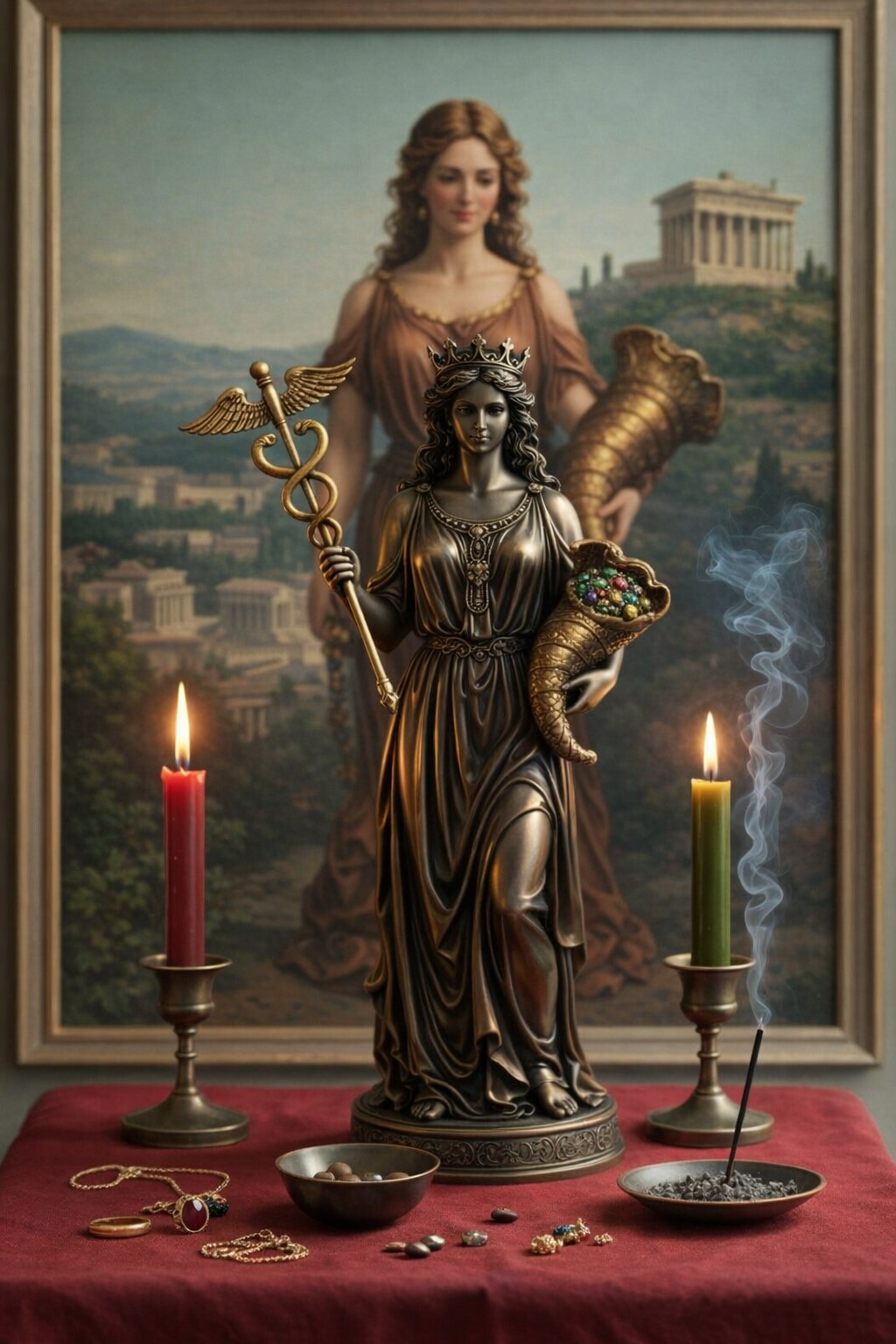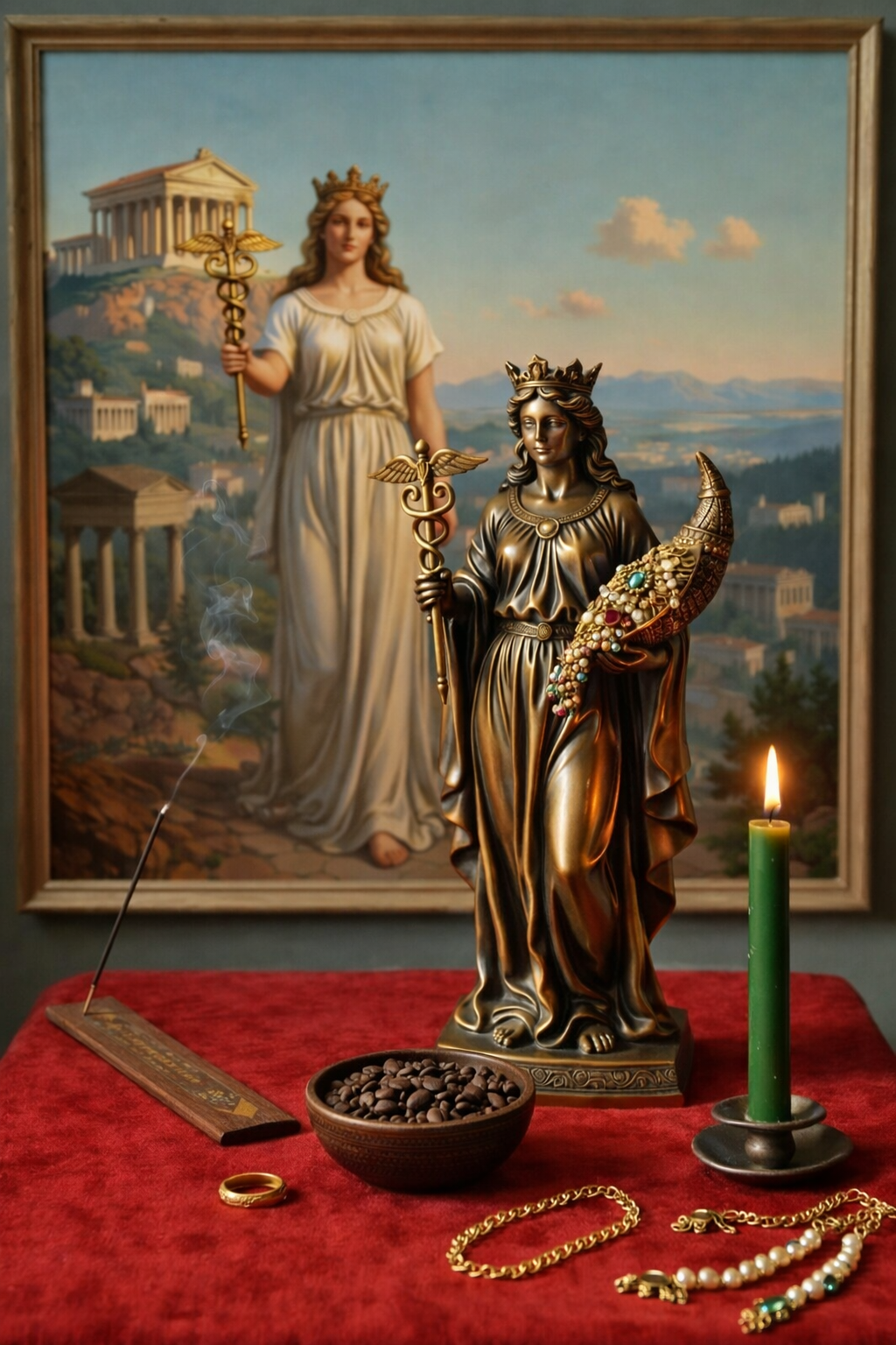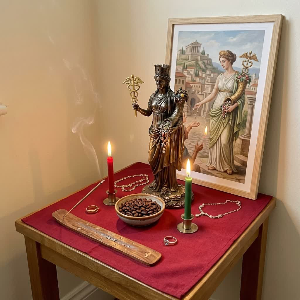 Желателен столик квадратной формы, который нужно покрыть алтарным полотном, желательно из бархатистой ткани или шелка. Цвет ткани должен символизировать для вас богатство и благополучие. Мне нравятся красный и черный цвета. Свечи желательно восковые, зеленого и красного цветов (это символика материального благополучия, любви и здоровья). При работе в соответствии с западной традицией можно по углам алтаря поставить белые свечи, но это не обязательно. Так же можно использовать цвета по планетарным и/или стихийным соответствиям. Можно использовать благовония (ароматические палочки). Хорошо подходит аромат розы.
